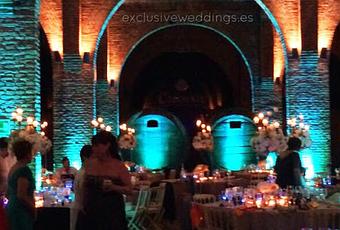 Así que decidimos que como estas Cavas eran enormes y tenían muchas columnas, aparte de una iluminación perimetral con velas por toda la cava entre las cubas, íbamos a iluminar columna por columna desde abajo hacia arriba con luces led que cantarían de color según el momento de la boda en que se estuviera... (un verde azulado para la entrada de invitados con muchas velas altas y bajas en los centros y flores blancas para dar más luminosidad a las mesas, un color anaranjado para el momento del banquete, un color fucsia para los momentos sorpresas, un color amarillo para el baile nupcial y un color azul klein para el baile y fiesta combinado con el fucsia que suele quedar genial).