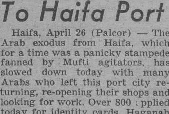 Haifa, April 26 (Palcor) — The Arab exodus from Haifa, which for a time was a panicky stampede fanned by Mufti agitators, has slowed down today with many Arabs who left this port city returning, re-opening their shops and looking for work. Over 800 applied today for identity cards. Haganah forces imposed a curfew on evacuated areas today as a measure to protect Arab property. Haganah is in full control of the seaport and the entire Biblical Valley of Zebulon. Control of the valley was secured yesterday when Haganah forces overran Ralad esh Shiekh. Administration of Haifa is returning to normalcy under Haganah control. A custodian of enemy property and of holy places has been appointed. Work in the port area, which came to a virtual halt last week, resumed today and many Jewish laborers volunteered to take the place of Arab workers Who fled. For the first time in months traffic between the Hadar HaCarmel section and the old lower town was carried on without armored buses.