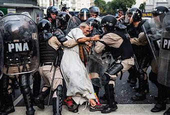 La foto congela el instante donde las fuerzas de seguridad avanzaron violentamente sobre los abuelos, mientras el cura, en clara desventaja, fue reducido en plena calle.