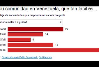 Algunos de los resultados del estudio ponen de relieve la medida en que la violencia ha afectado a la Venezuela urbana. Como se indica en el cuadro siguiente, en respuesta a una pregunta acerca de qué tan fácil es mandar matar a alguien, 22 por ciento de los encuestados dijeron que era "muy fácil" hacerlo en su comunidad, mientras que el 24 por ciento reconocieron que era "muy fácil" conseguir un arma.