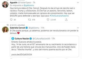 Todo comenzó con un tuit de la cuenta oficial del Ministerio de Cultura de la Nación, desde donde se recordó que este 14 de junio Ernesto “Che” Guevara hubiese cumplido 92 años. Gabriela Cerruti citó el mensaje y escribió junto a un corazón: “El Che poeta porque, ya sabemos, podemos ser revolucionarios sin perder la ternura”. En respuesta, un usuario expuso: “Que ternura daba el Che, Cerruti. Después te das el lujo de decirle nazi o racista a Trump y a Bolsonaro. El Che fue un asesino, terrorista, ladrón, violador, metía homosexuales en campos de concentración. Hay que ser basura para defender a ese tipo. Que asco #CheGuevaraAsesino”.