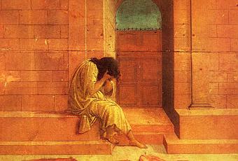 Pero esta historia fundacional de Roma, donde una gran mujer fue sacrificada sin amparo alguno, e injustamente por completo, serviría para inspirar ahora la interpretación de una escena sugerente. El cuadro disponía de una figura sedente, humillada ante los peldaños de una entrada regia y solitaria. Desolada y desconsolada ella, acercaba sus manos a un rostro oculto por éstas ante lo que parecía una mujer atormentada, despojada de sus túnicas sagradas en una dura muestra de rechazo, marginación y agravio. ¿Quién podría ser si no? Y así lo adquiriría el duque italiano a principios del siglo XIX, convencido de poseer un Masaccio que representaba a la tan famosa heroína romana.