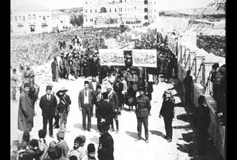Histórica foto de la primera reivindicación palestina. En los carteles puede leerse en árabe “Palestina es parte de Siria”