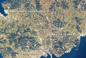 Las ciudades más grandes de la isla - ciudad de Ibiza, Sant Antoni de Portmany y Santa Eulària des Riu - aparecen como blanco junto a las regiones de color rosa cerca de las bahías costeras en esta fotografía de la Estación Espacial Internacional. Al igual que muchas de las Islas Baleares, la principal industria de Ibiza es el turismo, y la ciudad de Ibiza y Sant Antoni de Portmany son particularmente conocidas por su vida nocturna.