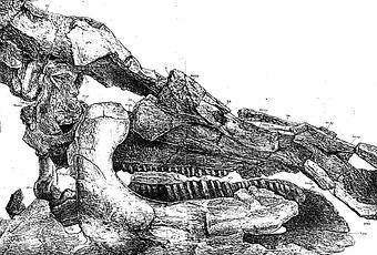 Cráneo de Telmatosaurus transilvanicus dibujado por Franz Nopcsa en 1935 en su obra Dinosaurierreste aus Siebenbürgen. Licensed for Public Domain.