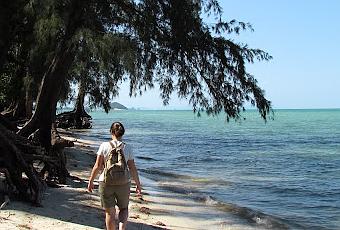 Habíamos visto desde el barco una enorme playa medio escondida entre los cocoteros, que resultó ser la playa de Lipa Noi. Comenzaba donde acababa la población de Nathon, y se extendía a lo largo de toda la bahía, y además parecía no acabar nunca. Así que, ya que la teníamos a un corto paseo de Nathon ¿para qué ir a buscar otras playas en la otra punta de la isla, y encima a los pies de los resorts? Es cierto que el interior de esta frondosa isla ofrece algún bonito paisaje, e incluso posee pequeñas cascadas que eran interesantes de visitar, pero siendo las nueve de la mañana y con el termómetro rondando los 27 grados en ese soleado día de febrero, no nos apeteció lo más mínimo meternos en un taxi y recorrer tortuosas carreteras. Preferimos holgazanear en la playa y bañarnos bajo el implacable sol tropical, y dejar esas visitas para otra ocasión.