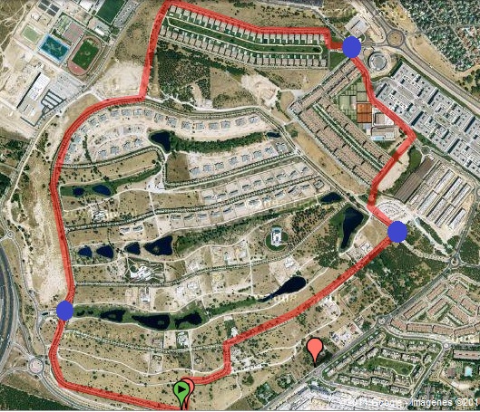 En la foto de arriba, podéis observar todo el perímetro de seguridad de la Urbanización: Los circulos azules son los tres puntos de acceso a la misma. Abajo, una imagen más detallada del triple perímetro de seguridad
