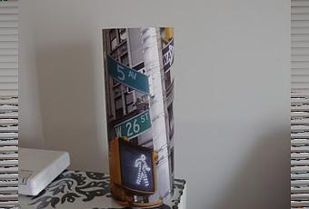 He transformado esta lámpara, que me parecía muy sosa, pegándole por encima un salva-mantel que compré de NY.