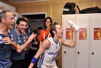 el Mundial de 2010. El grito bien podría ser también "¡Gruda! ¡Gruda!", poderosa y fiable en la zona (16 puntos y 12 rebotes). Pero Céline Dumerc (Tarbes, 1982) también se lo merece, pues tuvo la frialdad, y la suficiente temeridad para jugarse tres triples en 1m 3s y acertar con el tercero (61-54 a 1m 34s). No se rindió España, y replicaron Anna Cruz y Marta Xargay (61-58 a 56'7 segundos). El resto resultó dramático: pasos de Gruda, entrada que se pasea por el aro de Cruz, Cata-Chitiga pisa la línea y Alba Torrens, desequilibrada, falla un triple (1/4, 3/10 su equipo). La alero mallorquina cometió dos personales y Dumerc no falló un par de tiros libres para clasificar a Francia para una final en la que se batirá a Serbia. España, hasta ahora invicta, se jugará el bronce ante Bielorrusia. La fotografía de Ciamillo Castoria, de FIBA Europe, que ilustra este artículo retrata la alegría de una Dumerc dando saltos en el vestuario francés con un bidón de agua en la mano. La base del Bourges le tenía ganas a España, pues no estuvo nada bien ni en el final de aquel partido del Mundial de la República Checa de 2010 ni tampoco en los últimos minutos del Eurobásket de 2013. Entonces le comieron los nervios y acabó desolada. Esta vez era una jugadora eufórica que festejaba el triunfo ante un rival al que nunca le falta la actitud. Basta con ver cómo entró en la pista Luci Pascua, que no había jugado ni un minuto en cuartos, y frenó a Gruda todo lo que pudo. La pívot del CB Conquero anotó sus cinco puntos en el primer cuarto (15-13). Impulsada por Marta Xargay y la propia Pascua, España se repuso del huracán inicial francés (7-0 a los 58 segundos). Un parcial que había cerrado Dumerc con un triple, el único que anotó su equipo en ese período (1/5). El triple de Sílvia Domínguez