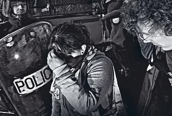 Pocas veces una instantánea logra aglutinar tantoscontrastes. Si se fijan bien, además del dolor y la vergüenza de la mujerexpulsada de su hogar, podemos ver a su derecha a quien parece un periodistaanhelante de declaraciones, pero lo que verdaderamente rompe moldes es laexpresión del policía tras su visera de despejar disturbios, esa tristezaimposible de ocultar y esos ojos que brillan y no precisamente de ira.