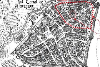 PLANO ANTIGUO DE CORRAL DE ALMAGUERTOMADO DEL BLOG TRES CULTURAS. LO AÑADIDO EN ROJO ESTÁ SUPUESTO POR MÍARTÍCULO DE RUFINO ROJO GARCÍA-LAJARA, “FUNDACIÓN E HISTORIA DE CORRAL DE ALMAGUER”