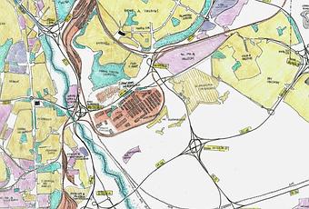 ----en las lupas se ha representado la topografía y la hidrografía significativas, las grandes infraestructuras viarias y ferroviarias, el perímetro de las grandes áreas residenciales (en color marrón claro) o industriales y de almacenaje clásico (lila), así como los polígonos o implantaciones singulares específicamente logísticas (en rojo). Hay que señalar que bastantes de lso espacios de actividad antiguos (anteriores a 1990) y algunos de los nuevos polígonos industriales (vg, el Área Empresarial Andalucía) están más o menos infiltrados por las actividades logísticas, en la medida en que la reconversión (que suele implicar agrupación de parcelas) resulte viable.