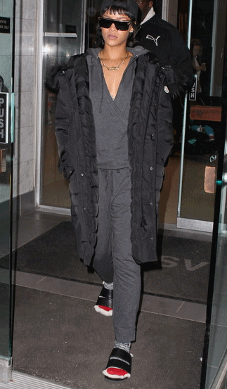 Pero ojo que este no es el único look sorprendente con el que Rihanna ha salido a la calle esta semana... hasta 3 la han cazado los paparazzi con atuendos que llaman la atención por poco convencionales. El primero es este conjunto de chandal, abrigazo y ¡chanclas peludas con calcetines!