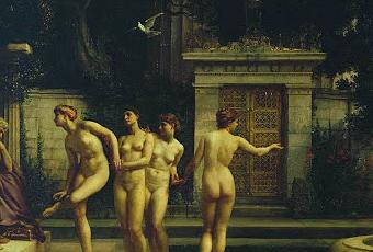Otro pintor prerrafaelita, tendencia británica muy arrolladora en los años finales del siglo XIX, John Edward Poynter (1836-1919), lo fue además aquí, en esta obra suya, con dos rasgos que le diferenciaron del resto de sus correligionarios, lo clásico y lo académico. En 1880 creó su obra Una visita a Esculapio. El tema elegido por el autor versará en la mitología griega, pero será el pintor quien diseñe lo que desea aquí pintar, una escena que no es clásica en el sentido que fuese ya relatada por los autores griegos antiguos. No, es recogida de un verso del poeta inglés Thomas Watson (1555-1592), el cual recreará una escena donde la diosa Venus, herida en un pie, visitará al dios de la medicina, Esculapio. Y además en una estancia muy clásica, donde las columnas griegas dominarán no solo ya parte de la imagen principal, sino que, detrás de las hojas de unos árboles, vislumbraremos grandiosas el talle inmenso de los fustes acanalados de varias columnas de algún gran templo heleno.