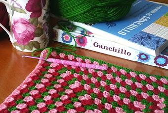 La foto que colgué la semana pasada en facebook no es de la misma manta. No tenía suficiente hilo de uno de los colores y además no me estaba quedando bien. Sin considerarme el colmo del perfeccionismo preferí empezar otra vez y para ello elegí de nuevo el granate, que parece estar llamado a ser uno de los colores del otoño, el rosa porque es mi color y el verde que tanto me llamó la atención en la tienda porque me recordó así de repente a mi abuela y a mi infancia, cuando me colocaba encima las toquillas de colores que tejía ella en ganchillo. Unos le llamarían a este verde "verde menta", otros "verde hoja", mi madre, en una de las suyas le llamaría "verde que te quiero verde", para mí es el "verde abuela" pero le cambiaré el nombre cuando entregue mi labor por "verde esperanza". Me gusta mucho está combinación (la de amor-esperanza).