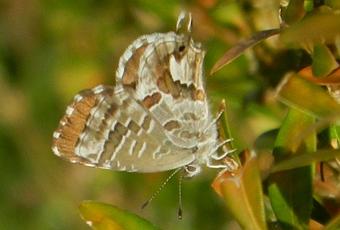 De hecho, en algunas zonas ya constituye una auténtica plaga, taladrando y echando a perder las larvas gran extensión de geranios, de lo que procede su nombre. Morfológicamente, como se ve, es uno de los licénidos con colitas, que además en su caso son muy notables. La parte inferior de las alas tiene un dibujo inconfundible, la parte superior tiene un tono marrón con un extenso borde blanco.