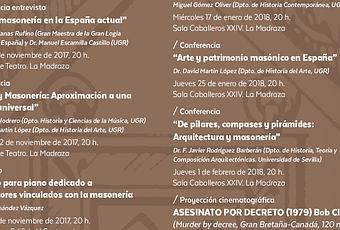 Finalmente, esta conferencia se encuentra inserta en el ciclo "Masonería y cultura. Conmemoración del III centenario de su fundación", que, con entrada libre hasta completar el aforo, organizan la Cátedra "Antonio Domínguez Ortiz", Cátedra de Arquitectura y Urbanismo, Cátedra "Francisco Suárez", Cátedra "Manuel de Falla", Cátedra de Patrimonio, Cineclub Universitario y Seminario de Estudios Latinoamericanos, de La Madraza-Centro de Cultura Contemporánea, Vicerrectorado de Extensión Universitaria de la UGR.