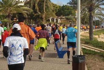 La mañana aparecía nublada y algo fría. Al final, tras llegar a meta no quedó más remedio que marcharnos a todo tren hacia las duchas para evitar el aire gélido que penetraba por nuestros huesos. Muchísima gente, demasiada. Infinidad de tropezones con los pies de los que iban a nuestro alrededor pero IMPRESIONANTE el ambiente. Paco acaba de hacer otra machada y se carga a sus espaldas los más de 21000 metros después de venir de Elche... ¡Uff!. Cerca de la salida nos fotografiamos con los grupos de amiguetes que han venido. Aquí estamos casi todos y, no en balde, Elche se convierte en la población que más corredores aporta a la prueba con cerca de 900. En esta línea os cuento una anécdota y es que a la hora de recoger los billetes del tren para la Maratón de Barcelona en la estación de Renfe, la persona que me atendió se extrañaba del gran volumen de ventas para el 4, 5 y 6 de Marzo: ¿Qué hay en Barcelona en estas fechas? - Me preguntó. Esto me alegró muchísimo pues una vez más y no sólo en Santa Pola seremos una gran masa de ilicitanos los que llevemos colorido y unas ganas locas de correr, simplemente.