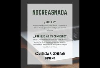 NoCreasNada es una página web creada para escritores freelance que disfrutan el escribir artículos de información general. Es un espacio de libre expresión en el cuál puede hablar acerca de lo que se te antoje siempre y cuando no viole los reglamentos de la comunidad. ¿Se puede ganar dinero con esta página? Por supuesto.