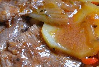 1 cebolla grande + cebolla de verdeo + 1/4 morrón rojo + 1 tomate mediano + sal/oregano + 2 dientes de ajo + Salsa Pronto Pizza y pomarola Pontevedra (una cucharada de postre de cada una)+ 3 papas + 1 boniato + 4 churrascos tiernizados
