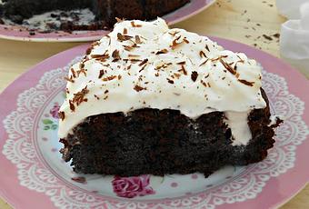 Es una tarta americana llamada "poke cake", a la que se le hacen muchos agujeritos, que se rellenan con crema, mmmmm...Y aproveché para usar la receta de la "mejor tarta de chocolate" que es la receta que uso para la Selva Negra tomando prestada la versión de Trini del blog Curry y chocolate.