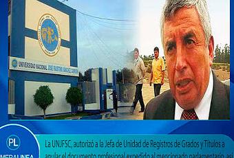 Como se recuerda, el siempre cuestionado parlamentario fujimorista fue denunciado ante la Comisión de Ética del Parlamento por plagiar su tesis para ser abogado a través de la mencionada institución universitaria.La UNJFSC, autorizó a la Jefa de Unidad de Registros de Grados y Títulos a anular el documento profesional expedido al mencionado parlamentario, así como el diploma respectivo. (Diario La República)