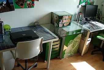 Esta es mi mesa de trabajo de nuestra habitación verde. En realidad son dos (una para mi chica y otra para mí) unidas por un cristal templado resistente a los golpes.