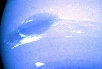 Imagen tomada por la sonda espacial Voyager 2 a su paso por Neptuno en agosto de 1989. En el medio se aprecia la Gran Mancha Oscura, acompañada por nubes blancas y brillantes, en proceso de sufrir rápidos cambios en su apariencia. Las velocidades del viento en la región cercana al ecuador alcanzan los 1300 kilómetros por hora, y se mueven en dirección oeste, mientras que los vientos de latitudes más altas van hacia el este, alcanzando un máximo de 900 kilómetros por hora. (Foto: NASA)