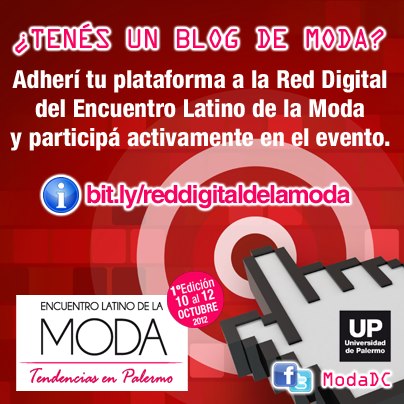 La agenda del evento es variadísima, si desean verla, entren acá y para anotarse -hoy cierra la inscripción- pueden hacerlo aquí, Cada asistente tendrá su acreditación y certificado correspondiente. No dejen de participar, grandes referentes de la industria de la moda, académicos y medios de comunicación estarán presentes. Como miembro de la universidad, agradezco que las autoridades me hayan convocado para coordinar el Plenario y formar parte de la creación de esta Red que abre las puertas para que los medios digitales tengan(mos) un espacio de encuentro y capacitación dentro del marco académico de la UP. ¿A ustedes qué les parece esta iniciativa? ¿Ya sumaron sus medios digitales al Directorio? ¿Van a participar de alguna actividad del Encuentro Latino? ¡Cuenten, amig@s! Nos leemos, besitos:>