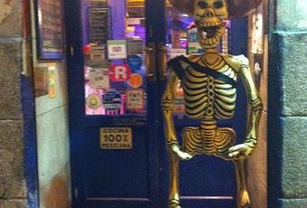 En la noche de los muertos nos recibía este esqueleto mexicano en la puerta del restaurante La mordida de la calle Belén, 6.