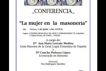 El próximo viernes, día 1 de junio, a las siete y media de la tarde, en el Centro Municipal de Arte y Exposiciones de Avilés, ubicado en la calle Llano Ponte, 49, se desarrollará bajo el título "La mujer en la masonería", una conferencia a cargo de Doña Ana María Lorente Medina y Doña Concha Pedrosa López. El nombre de la primera de las ponentes no nos es desconocido en este espacio, pues se trata de la Gran Maestra de la Gran Logia Femenina de España, que estará presente en Asturias durante estos días para participar también en un acto de trascendencia estríctamente masónica: el Hermanamiento de una Logia gijonesa, la Estrella del Norte, y una francesa, Diotima, de Marmande, adscritas ambas a las Obediencias femeninas que trabajan en ambos países (GLFE y GLFF). La segunda de las ponentes también me resulta conocida. Concha Pedrosa López, historiadora, y a la que ya hemos escuchado en alguna ocasión al tratar sobre la obra de Marie Déraismes.La presentación de este acto organizado por la masonería femenina asturiana correrá a cargo de alguien a quien también conozco: Paz Rodríguez Sánchez.