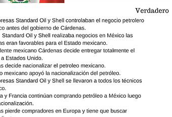 Tampico, el petróleo mexicano pertenece a la Standard Oil. Al sur, a la Shell. México paga caro su propio petróleo, que Europa y Estados Unidos compran barato. Las empresas llevan treinta años saqueando el subsuelo y robando impuestos y salarios cuando un buen día Cárdenas decide que México es el dueño del petróleo mexicano...Inmensas multitudes se lanzan a las calles en manifestación incesante, llevando en hombros ataúdes de la Standard y la Shell, y con música de marimbas y campanas los obreros ocupan los pozos y las refinerías. Pero las empresas se llevan a todos los técnicos..., y no hay quien maneje los indescifrables tableros de mando. La bandera nacional flamea sobre las torres silenciosas. Se detienen los taladros, se vacían las tuberías, se apagan las chimeneas. Es la guerra contra las dos empresas más poderosas del planeta y sobre todo la guerra contra la tradición latinoamericana de la impotencia, la colonial costumbre del no sé, no puedo.La Standard Oil exige la inmediata invasión de México. Cárdenas advierte que incendiará los pozos petroleros si asoma un soldado en la frontera... la corona inglesa anuncia que no comprará una gota de petróleo mexicano. Francia dice lo mismo. México no encuentra quien le venda una pieza de repuesto... Cárdenas... busca clientes en la áreas prohibidas, la roja Rusia, la Alemania nazi, la Italia fascista, mientras las instalaciones abandonadas van resucitando poquito a poco: los trabajadores mexicanos... se las arreglan como pueden a fuerza de puro entusiasmo, y así la magia de la creación va haciendo posible la dignidad."