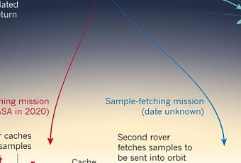 La NASA espera traer de vuelta a la Tierra las primeras muestras del suelo y de las rocas marcianas. Si hay suerte, esto ocurrirá en el 2020, cuando se lance el próximo rover cuya misión será recoger muestras del suelo del Planeta Rojo. Se enviarán dos misiones: un rover (en rojo) para recolectar muestras, otro segundo rover (en azul) para coger esas muestras y lanzarlas al espacio, poniéndolas en órbita, donde habrá un vehículo que las recogerá y las traerá de vuelta a la Tierra.