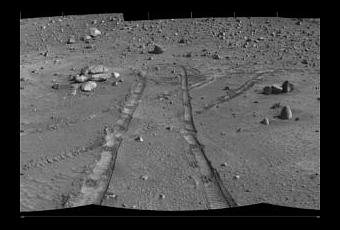 Mosaico de las “huellas” de Spirit en Marte. Imágenes tomadas el 5 de mayo de 2005. Crédito: NASA/JPL.