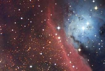 NGC 6559 es una nube de gas y polvo situada a una distancia de unos 5.000 años luz de la Tierra, en la constelación de Sagitario (El Arquero). La brillante región es un objeto relativamente pequeño, de tan solo unos pocos años luz de tamaño, en contraste con su famoso vecino, la Nebulosa de La Laguna (Messier 8, eso0936), que abarca cien años luz, según informa el Observatorio Europeo Austral en un comunicado.