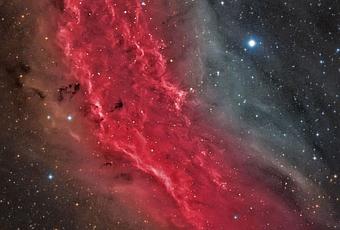 ¿Qué hace California en el espacio? La casualidad ha querido que esta nube cósmica, localizada en el brazo de Orión de la galaxia espiral de la Vía Lactea, tenga el mismo contorno que el estado de California , en la costa oeste de los Estados Unidos. Nuestro propio Sol, que también pertenece al brazo de Orión de la Vía Láctea, está situado a apenas unos 1.500 años luz de la nébulosa de California. También conocida como NGC 1499, esta clásica nebulosa de emisión cuenta con unos 100 años luz de longitud. En esta imagen el resplandor más prominente de la Nebulosa California es una luz roja característica de los átomos de hidrógeno que se recombinan con electrones a la deriva, despedidos e ionizados debido a la energía de la luz procedente de las estrellas. La estrella que con más probabilidad está produciendo esa luz energética que ioniza gran parte del gas de la nebulosa es la brillante, caliente y azulada Xi Persei, justo fuera del borde derecho de la fotografía.