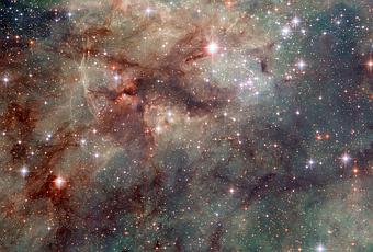 El telescopio espacial Hubble ha tomado este impresionante primer plano de una parte de la Nebulosa de la Tarántula presentada hoy mismo en la página del telescopio espacial. Es una región de formación estelar de gas de hidrógeno ionizado en la Gran Nube de Magallanes, una pequeña galaxia vecina de la nuestra Vía Láctea. Es el hogar de muchas condiciones extremas, incluyendo los remanentes de supernova y la mayor estrella que se ha encontrado.