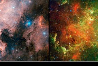 Comparación de la Nebulosa de Norteamérica en luz visible (izquierda) y en colores del infrarrojo medio (derecha). La imagen en visible se ha conseguido con el Digitized Sky Survey combinando datos en las bandas B y R y muestra claramente en rojo la emisión del gas ionizado, mientras que las nubes oscuras que dan forma a la nebulosa (destacando el Golfo de México) aparecen en color oscuro. La imagen en infrarrojo ha sido conseguida por el Telescopio Espacial Spitzer y contiene datos a frecuencia de 3.6 y 4.5 micras (en azul, revela la componente estelar), 5.8 y 8.0 micras (en verde) y 24 micras (en rojo), ambos colores mostrando la distribución de polvo en la nebulosa. Crédito de la imagen: óptico: DSS / D. de Martin, infrarrojo: NASA / JPL-Caltech / L. Rebull (SSC/Caltech).
