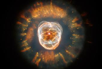 La foto fue tomada el 10 y el 11 de enero de 2000 con la Cámara Planetaria y de Gran Angular 2 en el interior del telescopio espacial Hubble. Los brillantes gases producidos por la nebulosa se muestran en esta imagen en colores : nitrógeno (rojo), hidrógeno (verde), oxígeno (azul), y helio (violeta). Clic para ampliar.