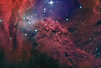 La forma, la textura visual y el color se combinan para dar a la región el popular nombre de la nebulosa Piel de Zorro. El resplandor azul característico de la izquierda es el polvo que refleja la luz de la estrella S Mon, la estrella que hay debajo del borde superior de la imagen. Las zonas rojas y negras son una combinación de polvo y emisión rojiza de gas hidrógeno ionizado. S Mon es parte de un joven cúmulo abierto de estrellas, NGC 2264, situado a unos 2.500 años luz en la constelación del Unicornio (Monoceros).