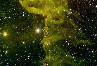 La parte de la araña del conjunto de nebulosas "La araña y la mosca", IC 417 en la que abunda la formación de estrellas, como se ve en esta imagen infrarroja tomada por el telescopio espacial Spitzer en combinación con el Micron All Sky Survey Dos (2MASS). Situada en la constelación de Auriga, IC 417 se encuentra a unos 10.000 años luz de distancia de la Tierra, situándose en la parte exterior de la Vía Láctea, casi exactamente en la dirección opuesta a nosotros desde el centro galáctico. Esta región fue elegida como el tema principal de un proyecto de investigación por un grupo de estudiantes, profesores y científicos como parte del programa de la NASA / IPAC Maestro Archivo de Investigación (NITARP) en 2015. Un cúmulo de estrellas jóvenes llamado "de 8" se puede ver en el centro havia arriba. La luz de este grupo recorta una forma de tazón en las nubes de polvo cercanas, vistas aquí como una pelusa verde. A lo largo de la sinuosa cola en el centro y hacia abajo, hay agrupaciones de estrellas jóvenes.