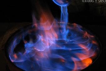 En el cazillo de barro, colocar la dos cucharadas de azúcar y un poco de aguardiente, prenderle fuego y muy despacio, se acerca al recipiente grande, hasta que el fuego pase de uno a otro. Dar algunas vueltas sin tocar demasiado el fondo.