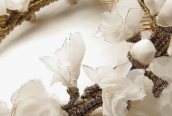 Nuestra clienta se puso en contacto con nosotros a través de internet para encargarnos su tocado y un cinturón a juego para su futuro enlace.La magia se produjo creando para ella, con una inspiración romántica, las dos piezas de sus sueños.El material de base, cordón de pasamanería con hilo metálico de un acabado oro envejecido, y, como ella misma nos proporcionó algo de tela, en la que estaba confeccionado su vestido, las pequeñas flores y capullos los hicimos con ella y los incorporamos a la preciosa tiara que coronará su pelo el día de su boda.Nos prometió algunas fotos de su enlace y ya estamos deseando recibirlas para disfrutar viéndola tan guapa!!!