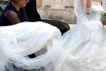 El sábado 5 de julio se casaba en Roma, ciudad natal de la novia, el príncipe Amadeo, sobrino de los soberanos belgas Felipe y Matilde, con su novia Lili Rosboch. Para la ocasión, la novia llevaba un diseño de Valentino de encaje de manga hasta el codo y escote al cuello con transparencias y cola larga. El pelo en un moño con velo y una tiara propiedad de la familia del novio. Créditos: Hola.