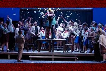 La puesta en escena de Daniel Slater, procedente de la Opera North de Leeds, traslada la acción desde la Bohemia del siglo XIX a la Checoslovaquia comunista de los años setenta. ¿Por qué? No lo sé. ¿Se gana algo con este cambio? Nada, que yo sepa. Es más, se pierde verosimilitud, y si la transformación del rico Micha en una especie de mafioso puede tener cierta gracia, la del casamentero Kecal en un comisario político no deja de resultar incomprensible. Por lo demás, la estética es fiel a la época, o sea, es fea y desangelada. El movimiento de los actores está cuidado y hay ciertos detalles que demuestran que Slater es un buen profesional, pero cuando el punto de partida es erróneo, poco se puede hacer para arreglarlo.