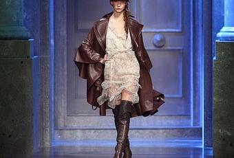 Chaquetas de caballería sobre delicados vestidos de muselina y encaje, volantes, botas altas y sombreros. Todo ello en un armonioso batiburrillo de materiales como cuero envejecido, mohair dulce, la piel de pony y el cuero perforado, en una paleta suave de colores. Las mujeres de Galliano se dejan embriagar por el sabor de la cerveza y seducen como el sonido del mar.