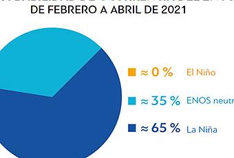 Pacífico tropical durante la temporada de abril a junio de 2021 son del 70 %." Por ahora, la probabilidad de que se produzca el fenómeno El Niño es casi nula. Continúa reseñando el informe de la OMM que "La Niña es un fenómeno que produce un enfriamiento a gran escala de las aguas de la superficie oceánica en las partes central y oriental del Pacífico ecuatorial, además de otros cambios en la circulación atmosférica tropical, a saber, los vientos, la presión y las precipitaciones. Por lo general, tiene efectos en el tiempo y el clima contrarios a los de El Niño, que es la fase cálida del ENOS". Ambas variables climáticas "son importantes condicionantes del sistema climático de la Tierra. Pero todos los fenómenos climáticos de origen natural ahora se producen en el contexto del cambio climático debido a la actividad humana, que provoca la subida de las temperaturas mundiales, exacerba los fenómenos meteorológicos extremos, altera la distribución de la precipitación estacional y dificulta la prevención de los desastres y la gestión de sus consecuencias", afirmó el Secretario General de la OMM, profesor Petteri Taalas. De acuerdo al último Boletín sobre el clima estacional mundial, que se elabora a partir de los pronósticos de los Centros Mundiales de Producción de Predicciones a Largo Plazo de la OMM, entre febrero y abril de 2021 se esperan temperaturas terrestres por encima de lo normal en todo el mundo, salvo en algunas pocas zonas de extensión muy limitada: