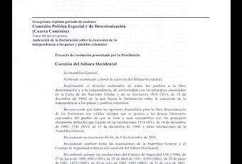 Nueva York, 15/10/12 (SPS)-. La IV Comisión de la ONU adoptó el 12 de octubre de 2012 una resolución sobre el Sáhara occidental por consenso en la que reafirma la responsabilidad de la ONU hacia el derecho del pueblo saharaui a la autodeterminación y reitera al mismo tiempo su pleno apoyo a los esfuerzos del Enviado Personal del Secretario general, Christopher Ross, para el logro de una solución justa y duradera que garantice el derecho del pueblo saharaui a la autodeterminación en conformidad con los principios de la Carta de la ONU y la resolución 1514 de la Asamblea general, de acuerdo a un comunicado de prensa del Ministerio de Asuntos Exteriores de la RASD.
