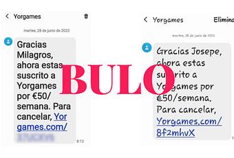 "Gracias Miguel, ahora estas (sic) suscrito a Yorgames por €50/semana. Para cancelar, Yorgames.com/dpUiIEN". En él, se afirma que te has suscrito a "Yorgames" por una cuantía de 50€ a la semana. Pero es un timo y ya ha alertado sobre él la Oficina de Seguridad del Internauta (OSI).
