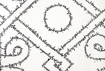 | La base de su trabajo es el dibujo, ahora bien, un dibujo que sustituye el lápiz por el alambre y la figura por las palabras. Se trata de una obra delicada y muy poética que explora la relación entre el dibujo y la caligrafía. Nuestra firma, comenta Calle, es de por si un dibujo, el texto escrito puede contener una belleza que va más allá de lo textual y se apodera de lo visual. Con las letras y las palabras Calle dibuja ritmos melódicos, pentagramas y nos muestra la poesía que subyace en todo acto de comunicación. |